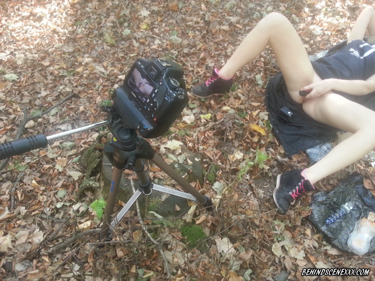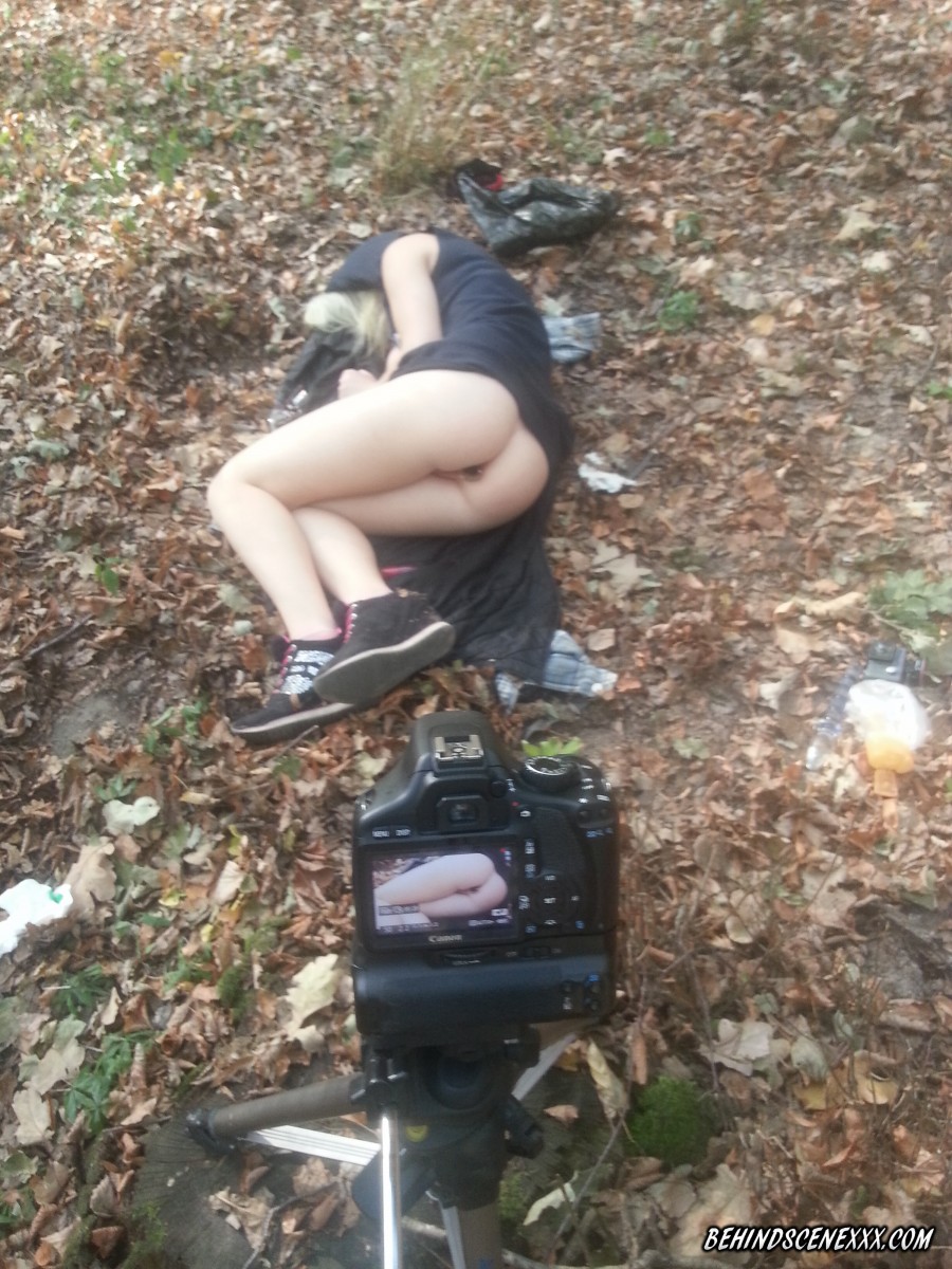 A woman lying on the ground in a forest, wearing a black dress pulled up to expose her pussy, legs spread, wearing black socks and pink shoes, while a camera is taking rapid selfie shots, photo, amateur, low quality, outdoors, bright sunlight, scattered leaves on the ground, green and brown, from above, looking down. Source: behindscenexxx.com
