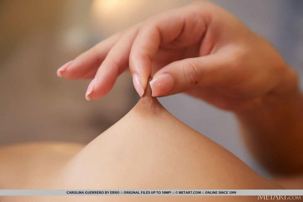 In this photograph, Carolina Guerrero, a young woman with long, dark hair and tan skin, is seated on a gray couch. She is topless, revealing small breasts, and wears only white panties, which she is pulling down slightly. Her pose is relaxed yet suggestive, with one leg bent and the other extended. Source: metart.com